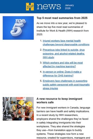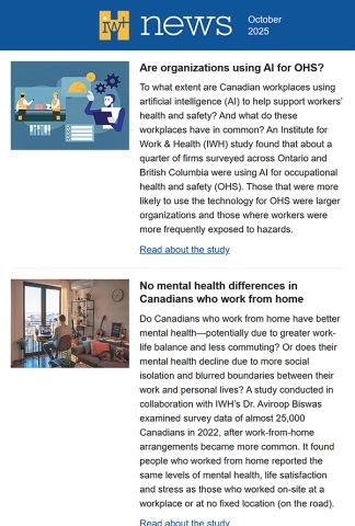IWH News is a monthly e-newsletter that alerts readers to the latest research publications, events, tools, achievements and more from the Institute for Work & Health. Every month, the e-newsletter offers short, easy-to-read articles that make it easy to scan for items of interest and click on the supplied link to find out more. The e-newsletter also includes findings and events from our research partners in Ontario’s prevention system.